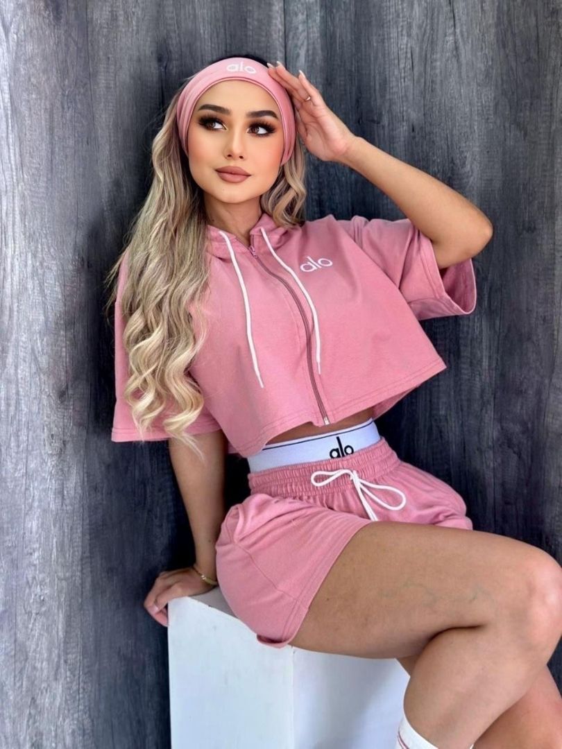 Este Set ALO con short está en total tendencia. Incluye medias a juego y cinta de cabello, creando un look completo y con personalidad.